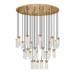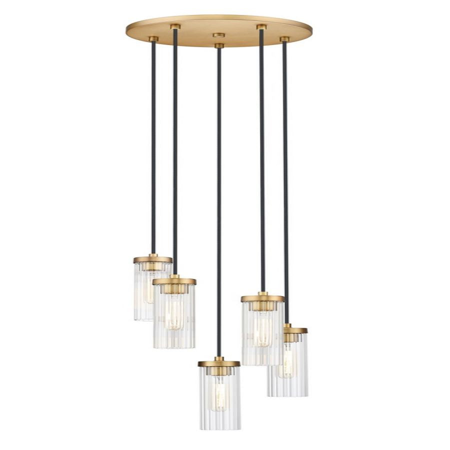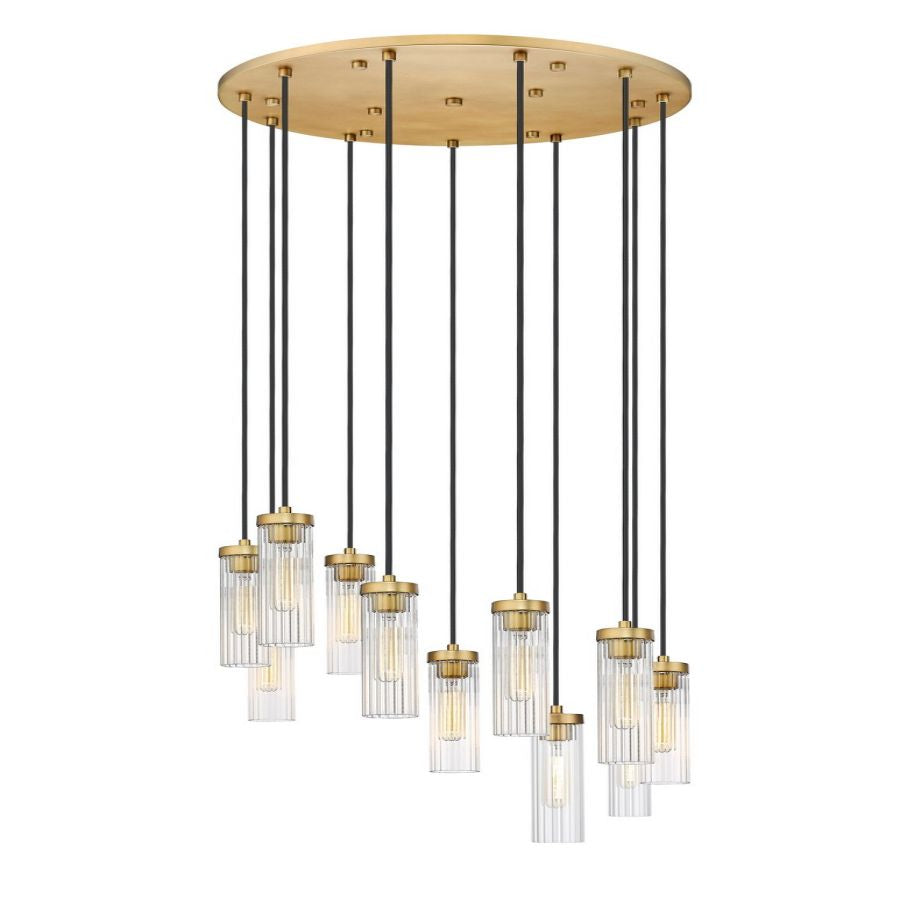 Iconic elegance is formed of a marriage between metal and glass shows gallery influence in this round chandelier. Embrace the artisan glam and minimalist sensibility of a fixture featuring delicate fluted glass shades that dangle at graduated lengths from a rich rubbed brass finish metal canopy and contribute optical intrigue.