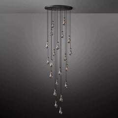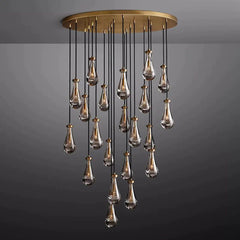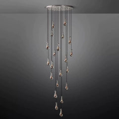 Much like the rhythm of a rainstorm itself. Suspended from slim black cords, drops of blown glass encase the bulbs – creating the illusion of underwater illumination – and cast luminous ripples that wash across ceilings and walls.