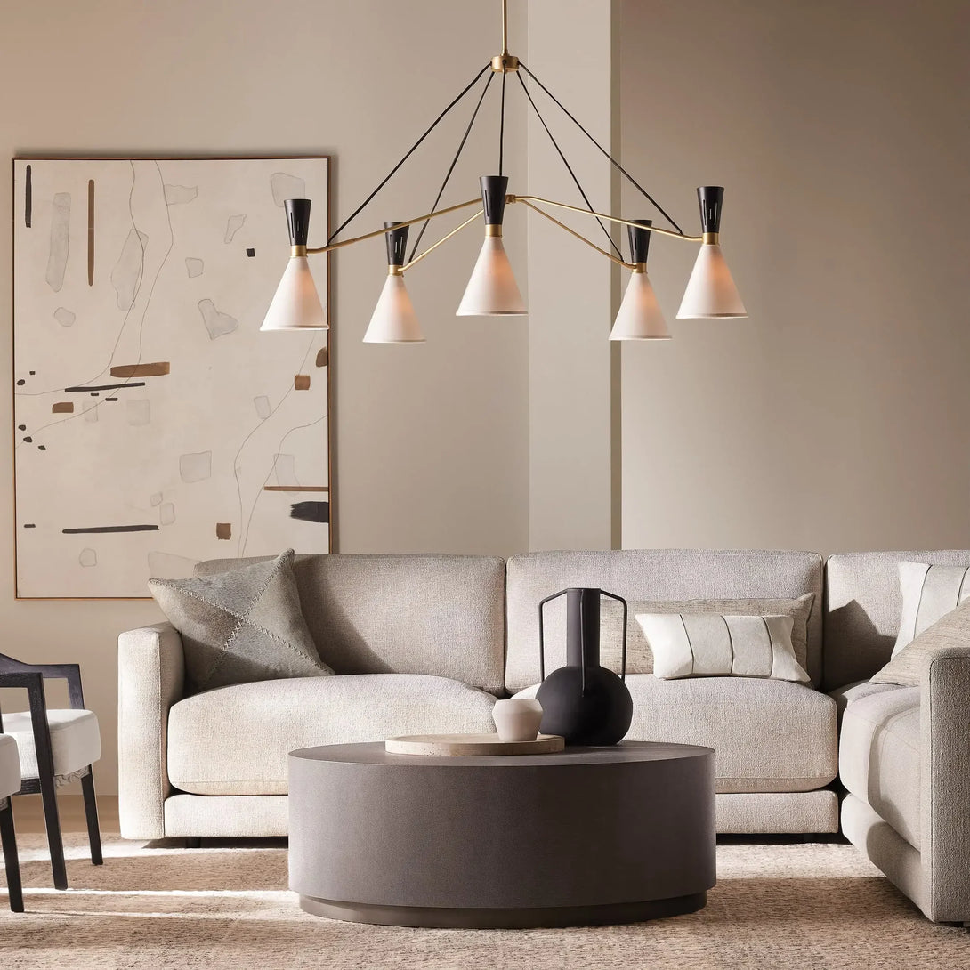 - Frame made from brass. Shades made from iron featuring a matte black finish and white fabric.