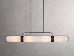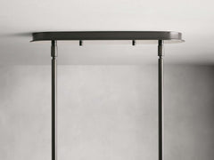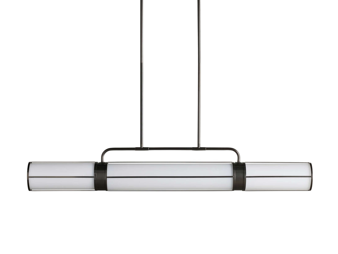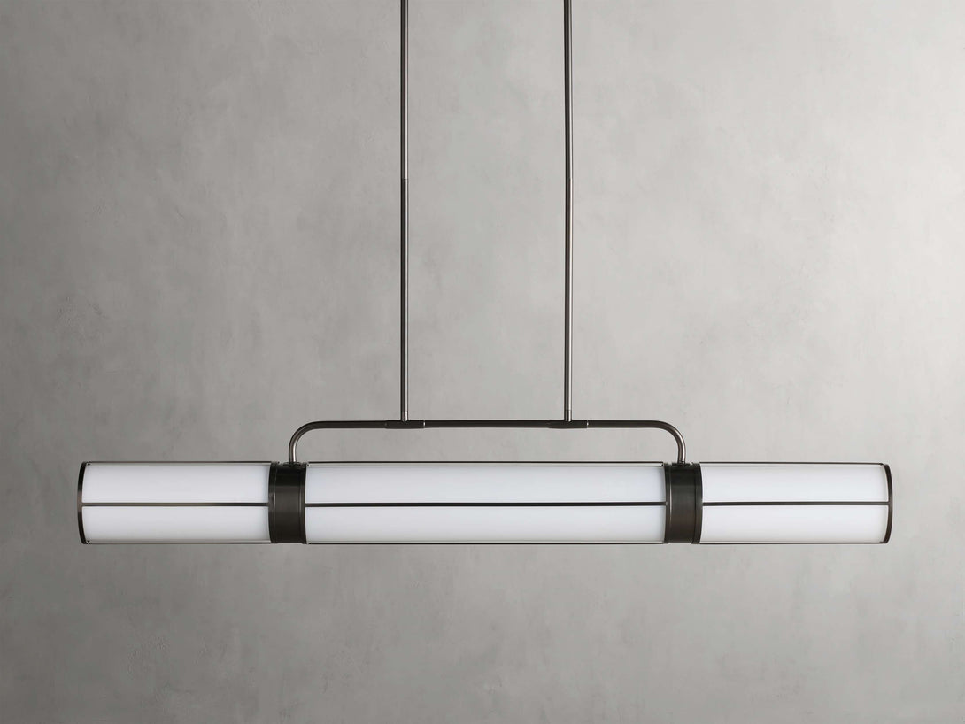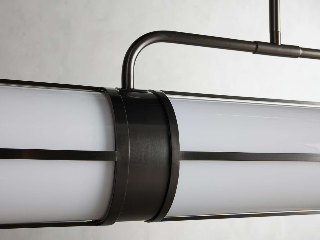 - This Arhaus-exclusive collection is crafted from burnished brass or bronze-plated steel with wrapped leather detailing and two frosted glass globes.