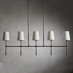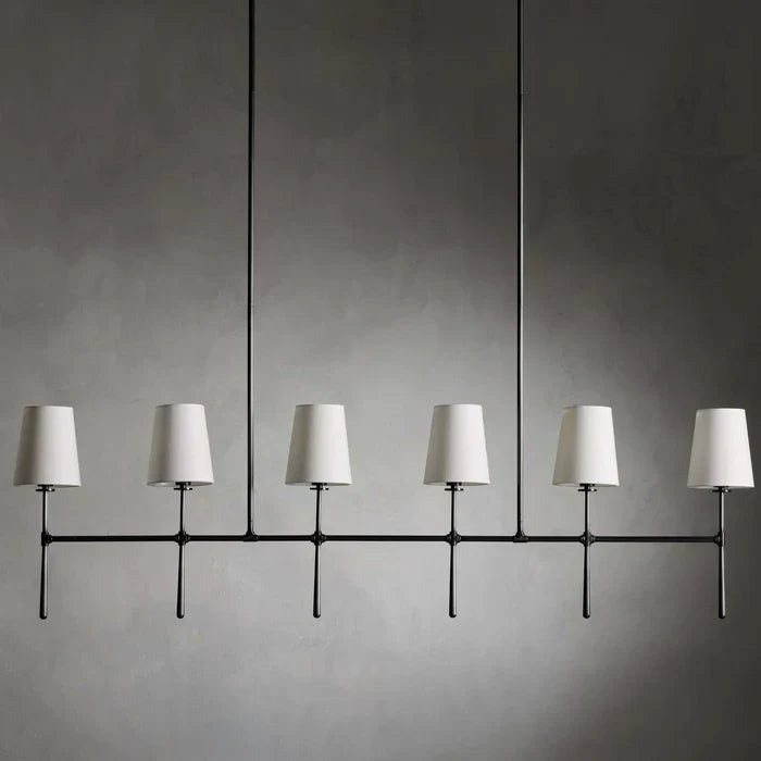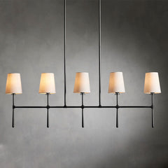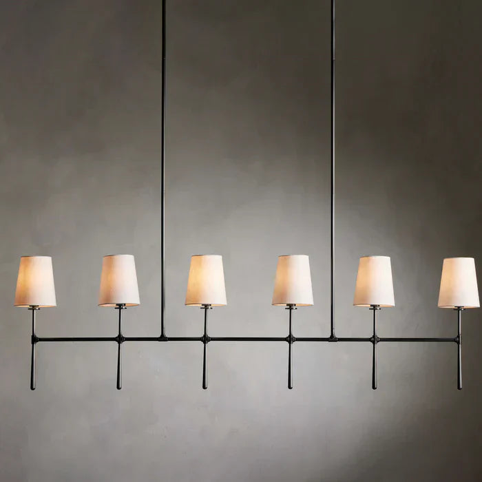- Crafted from steel with a bronze plated or burnished brass finish and tapered linen shades.
