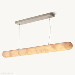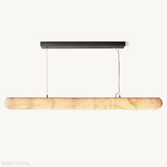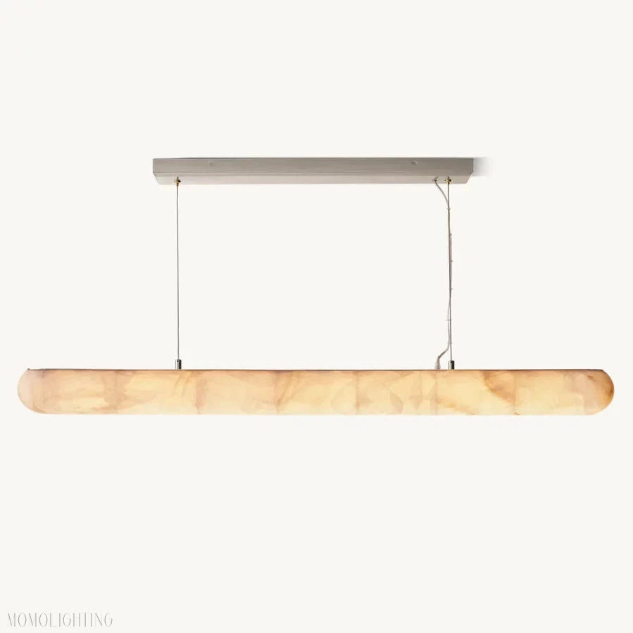 Our Rivage chandelier is minimalist in form and striking in effect, highlighting the beauty of calcite, a translucent stone that emits a warm, natural light. Suspended from slender steel cables, the chandelier’s halo of polished stone is skillfully pieced together to create a smooth, continuous surface, while subtle internal illumination highlights organic colors and textures. Each fixture is a unique statement.