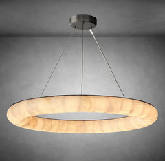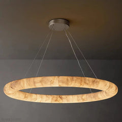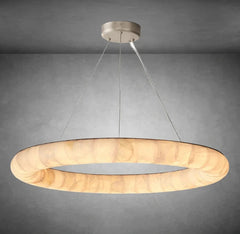 Our Rivage chandelier is minimalist in form and striking in effect, highlighting the beauty of calcite, a translucent stone that emits a warm, natural light. Suspended from slender steel cables, the chandelier’s halo of polished stone is skillfully pieced together to create a smooth, continuous surface, while subtle internal illumination highlights organic colors and textures. Each fixture is a unique statement.
