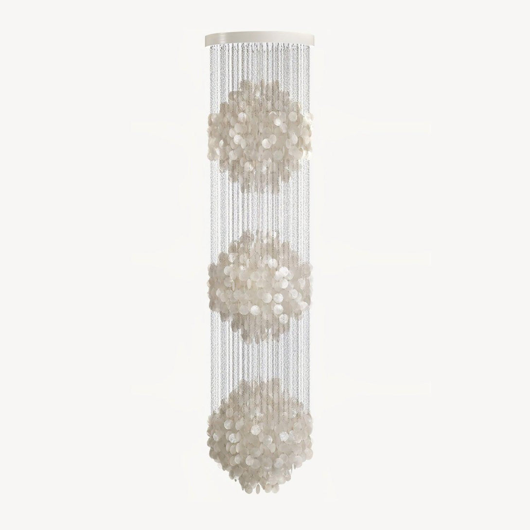 Designed to mimic a tranquil waterfall, this chandelier features strands of delicate shells that fall gracefully from a sleek metallic crown. Each shell is carefully selected and strung, creating a cascade of soft luminescence, casting enchanting patterns on your walls. Ideal for coastal-inspired decors or to bring a touch of nature’s calm into urban spaces, this chandelier is a conversation piece that will elevate any room’s aesthetic. Perfect for living areas, dining rooms, or high-ceiling entryways, the Shell Cascade Chandelier is more than a light fixture; it’s a centerpiece that embodies both art and light.