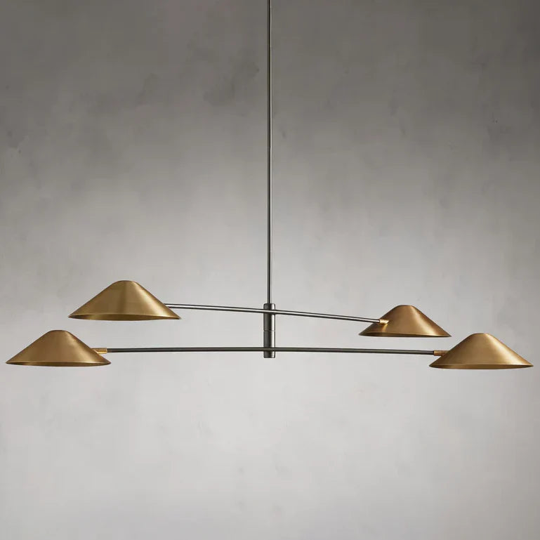 - Chandelier features pivoting arms for a linear or x-shaped silhouette and rotating shades to cascade light up or down.