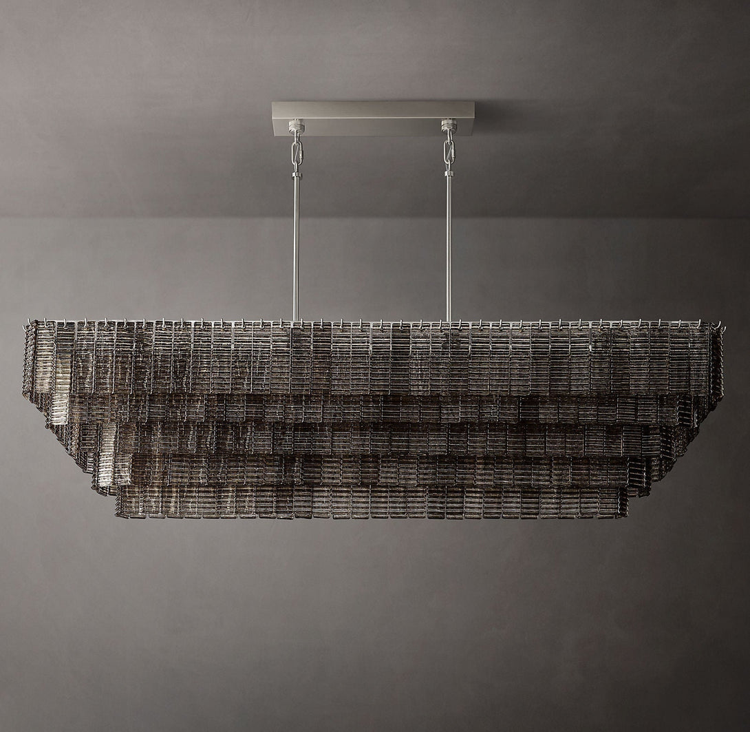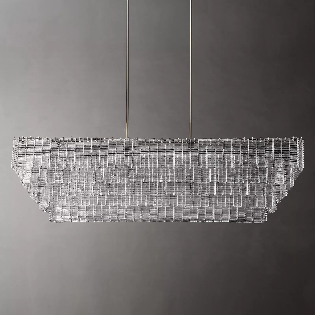 Our chandelier combines traditional glassmaking techniques with modernist style. A study in geometric repetition, the textured cast glass ribbons cascade in concentric circles, casting a warm glow to stunning effect.