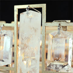 The Sovereign Sixteen-Light Chandelier radiates sophistication with its striking geometric form. Rows of clear and white-toned occluded crystals are arranged in precise layers, mounted on a steel frame finished in light champagne silver leaf. The alternating rectangular pattern adds visual depth, while sixteen candelabra lights provide a luminous, refined glow.