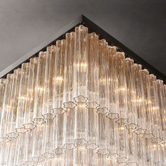 The collection creates a mesmerizing effect of liquid ice glistening in the light. The cascading glass layers feature fluted cylindrical pendants, each with fluid linear textures and loosely drawn flower shapes. When viewed from below, clusters of curvilinear forms create a shimmering pattern effect. Perfect for adding a touch of glamour and sophistication to any setting.