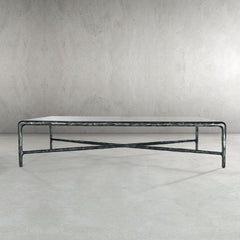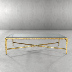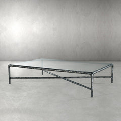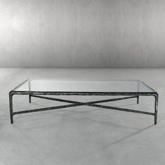 Our collection by the rustic sensibility of a hand-forged metal base with a clear glass top. Employing an ancient fabrication process, artisans hand hammer the metal bars to reveal an alive, imperfect and organic texture, a counterpoint to the frame's slender, tapered silhouette.