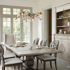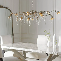 Like freshly fallen rain on draped garden vines, our Viticcio Chandelier is hand-moulded by Italian artisans from solid iron. Floral flourishes are elegantly accentuated by a hand-applied silver finish, and hand-strung crystals dangle to scatter drops of light around your space.