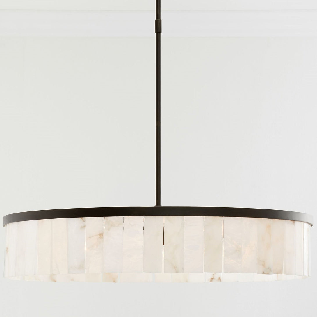 Add a note of rustic refinement to your living space with our Windham Collection. This chandelier’s iron frame has understated simplicity embellished with solid alabaster tiles. Striking either illuminated or not, the natural stone material lends a sense of warm and earthy elegance.